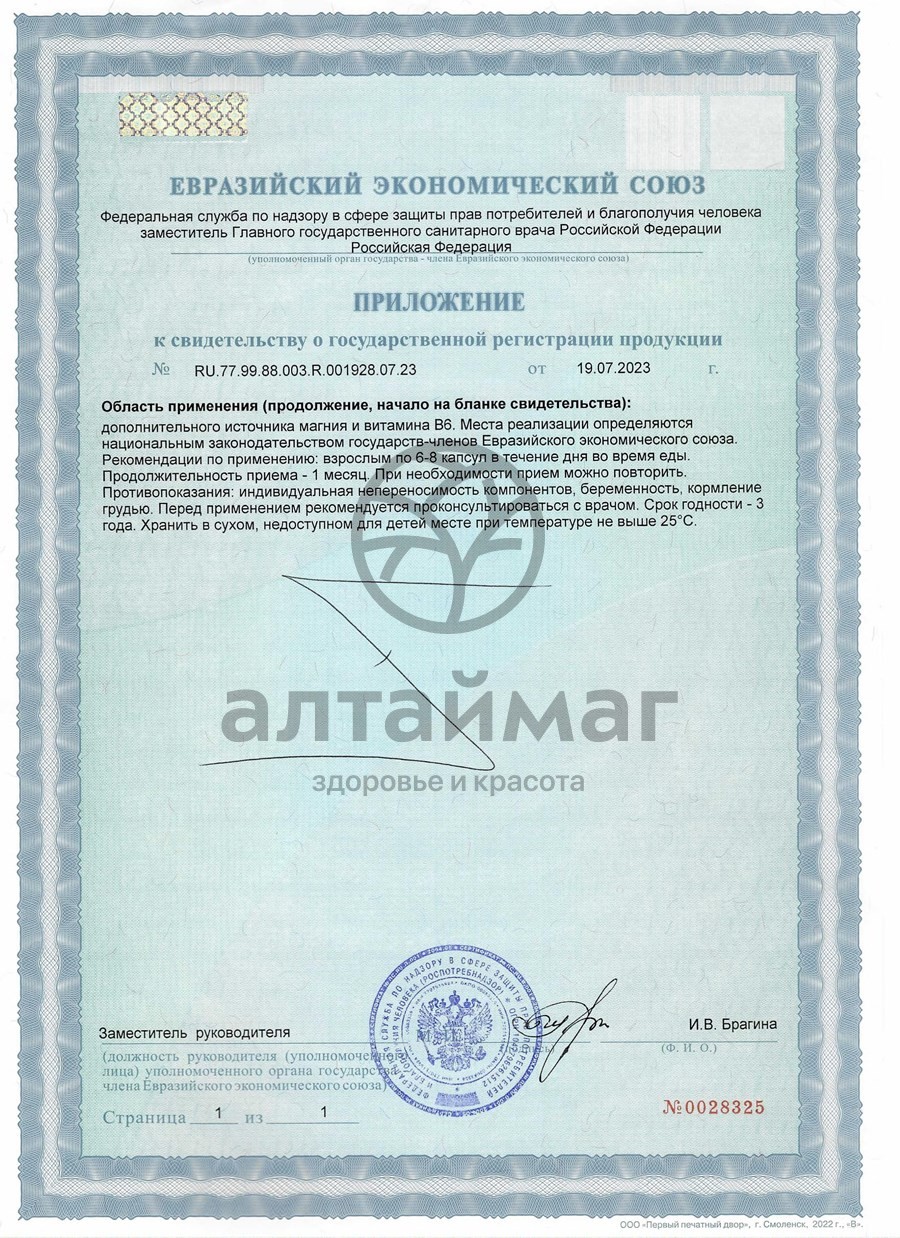 Магний – 300-400 мг (из магния бисглицината); витамин В6 (пиридоксина гидрохлорид) – 4,5-6,0 мг. Вспомогательные вещества: антислеживающий агент тальк, капсула (желатин).Способ применения